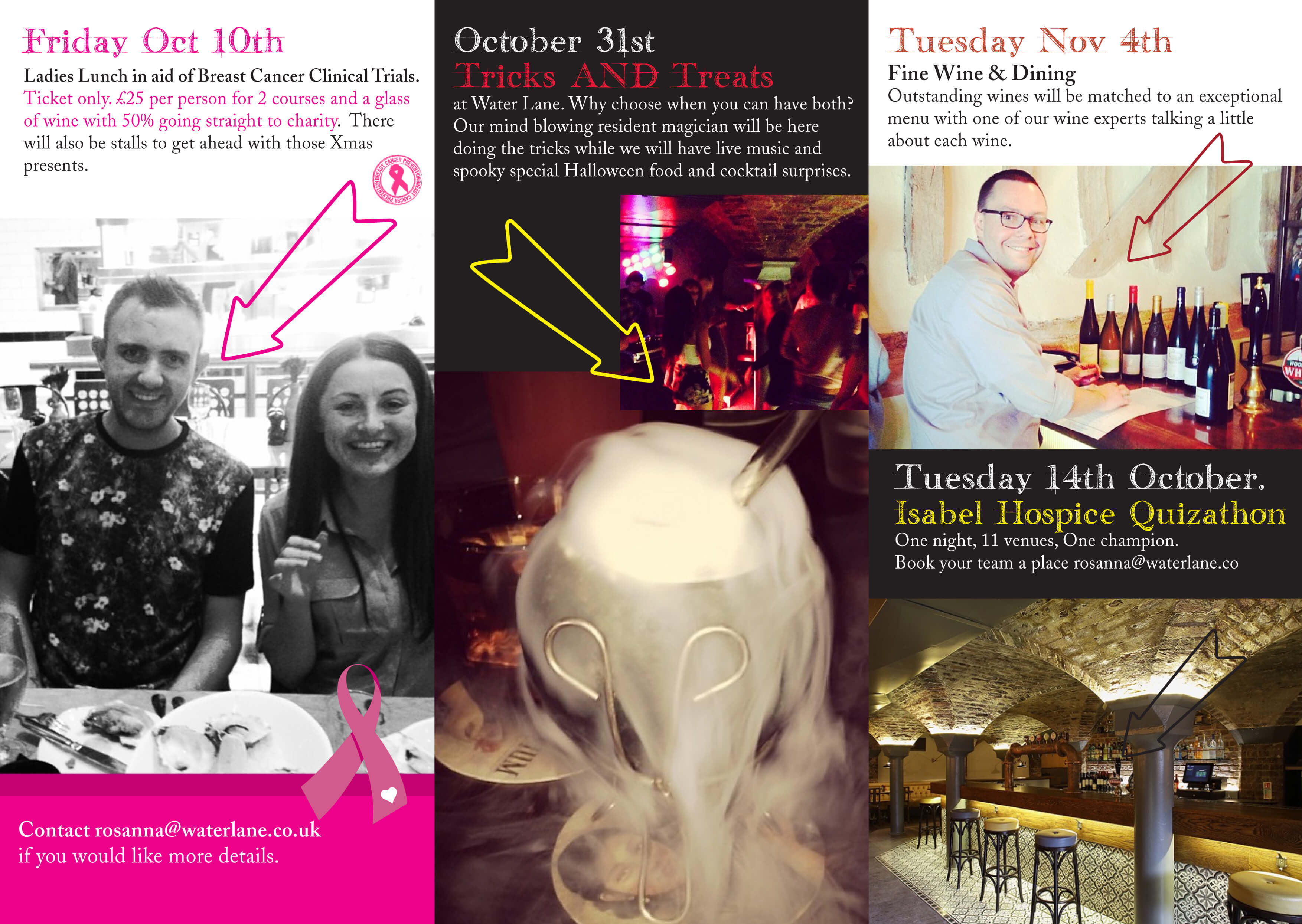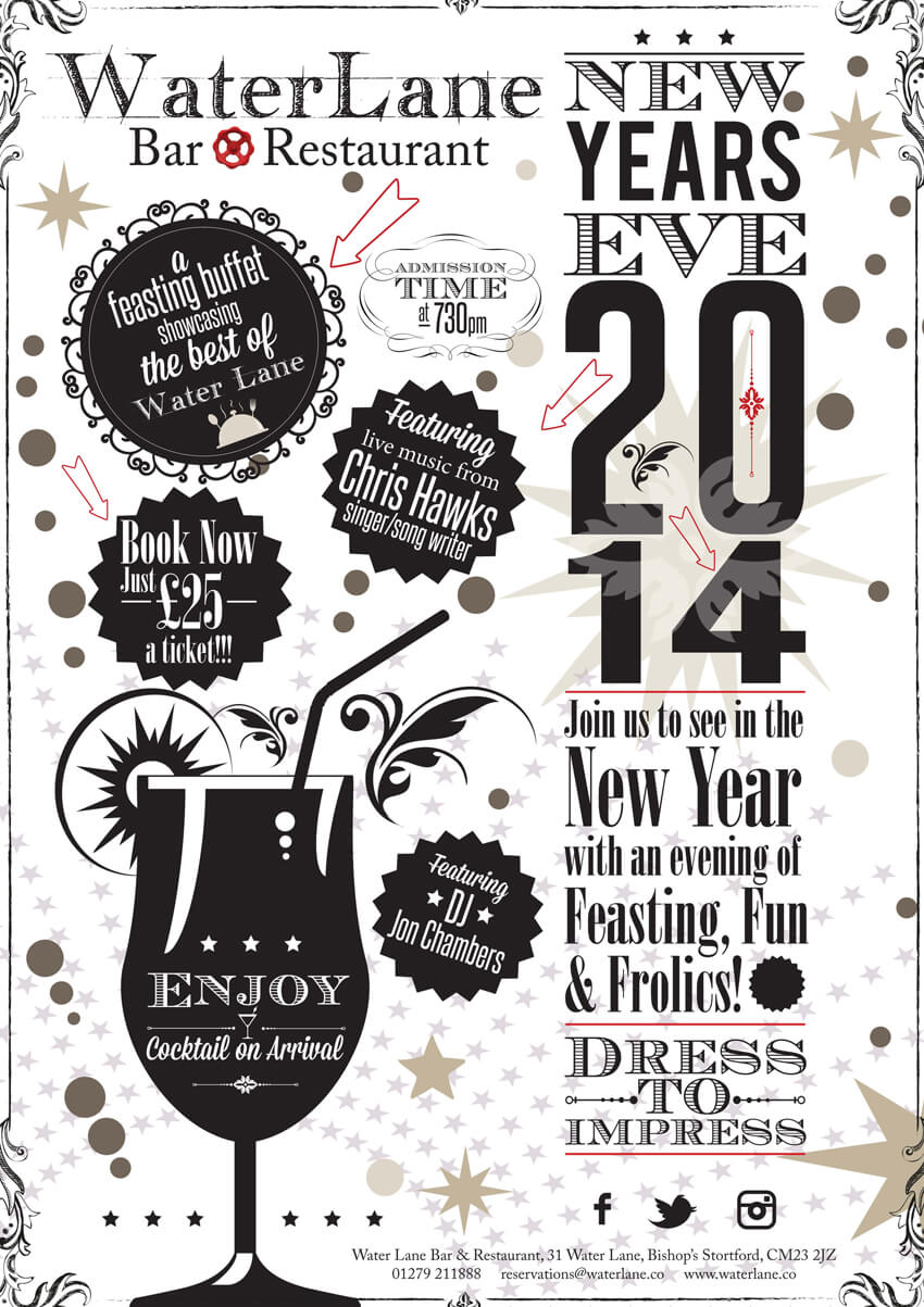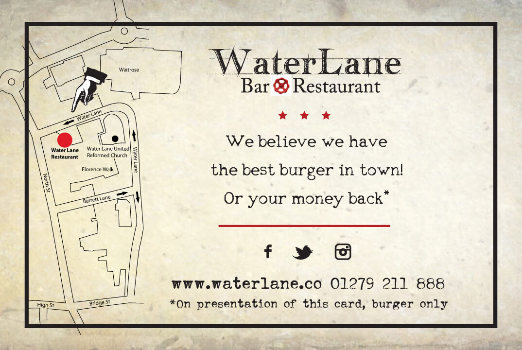 Water Lane is a very cool bar/restaurant in Bishop Stortford, The Nye family found the run down building and gave it a new lease of life. The guys had already came up with the look they wanted to achieve for the business. Tanktop wanted to work on staying on message with the brand story and it was our job to make sure all internal promotional material and menu’s resonates the same brand meaning but with our own touches to keep the brand exciting and help with the clients experience .
